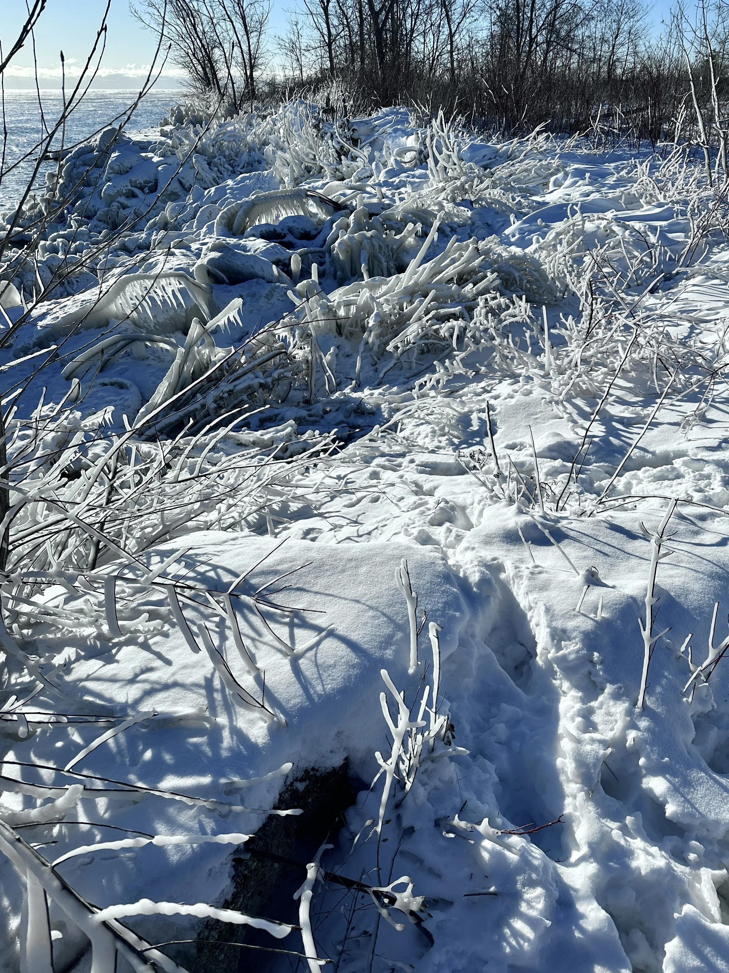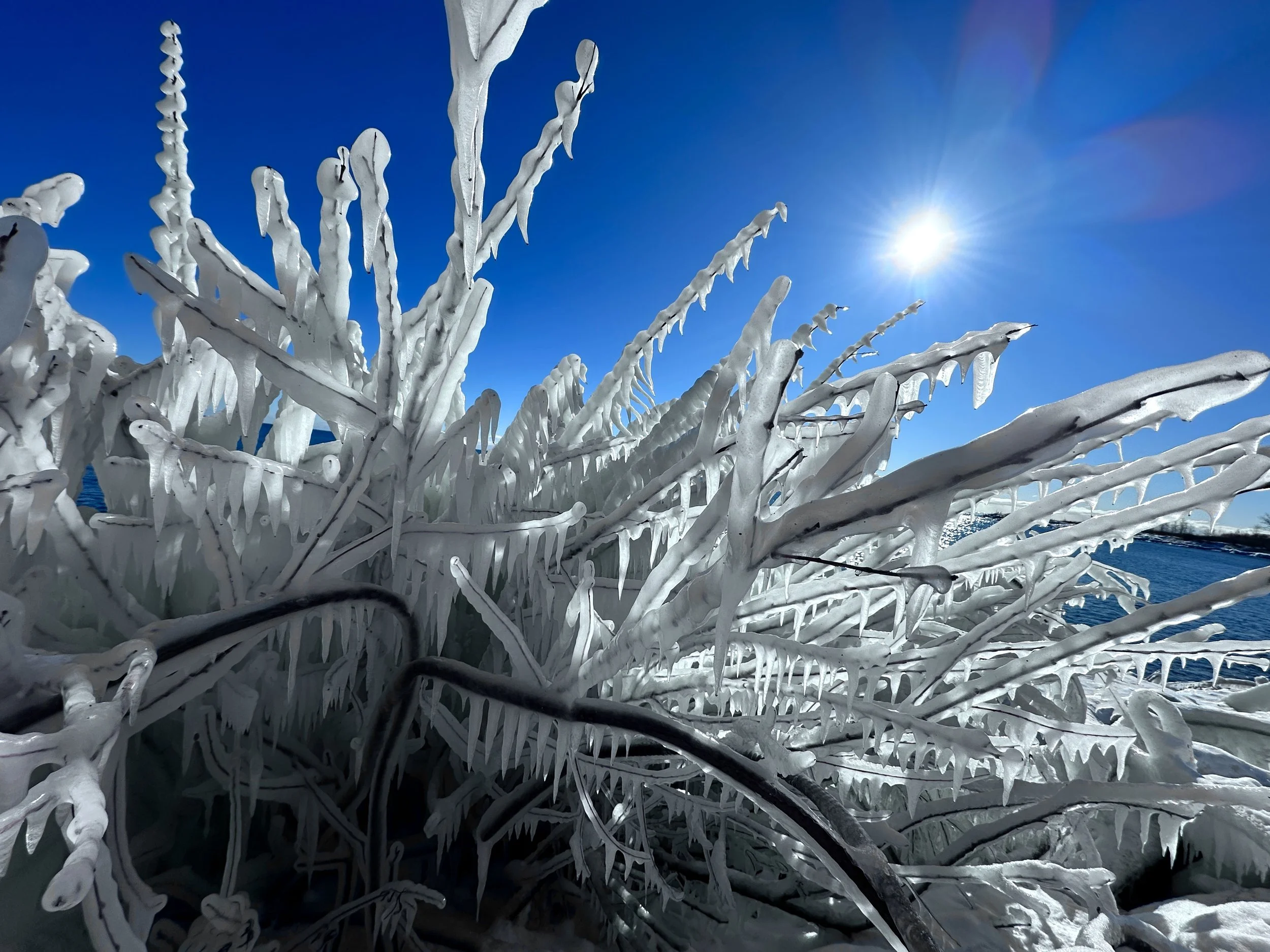 Along the shore, the spray of water has also coated plants in otherworldly skins of ice.